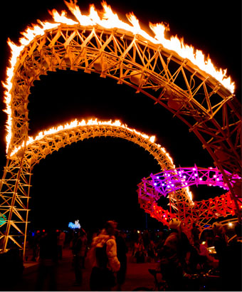 Prados is one of forty-odd "Flaming Lotus Girls"—a loose-knit troupe of artists, engineers, and anyone else, who have, for the by xi years, conceived of, designed, and built massive-calibration, fire-animate works that come to life at the annual party in the desert. By day, he's the director of hardware applied science at Earthmine, a company that makes the tools to produce the "Street View" on Google Maps.